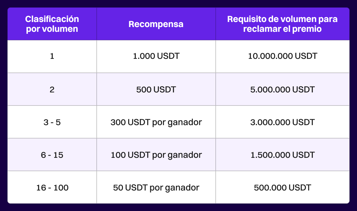 ¡Muestra tu poder para hacer trading y destácate entre la multitud del Carnaval! ¡Opera más para ganar! Alcanza el volumen más alto de la competición para obtener 1.000 USDT.